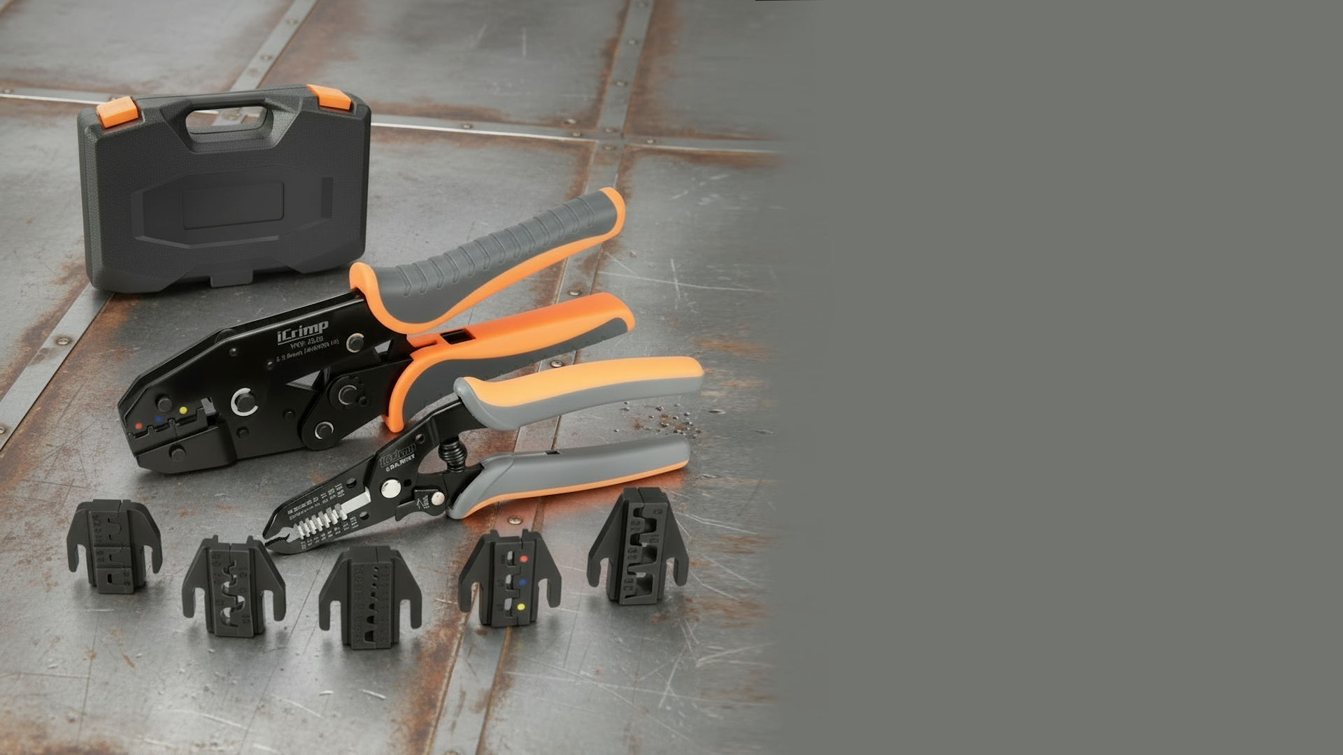 IWS-RCK-HD is a heavy duty all-in-one wire terminal crimping tool set which includes an HS series crimper, 6 quick changing die sets, one wire stripper as well as a carrying case.